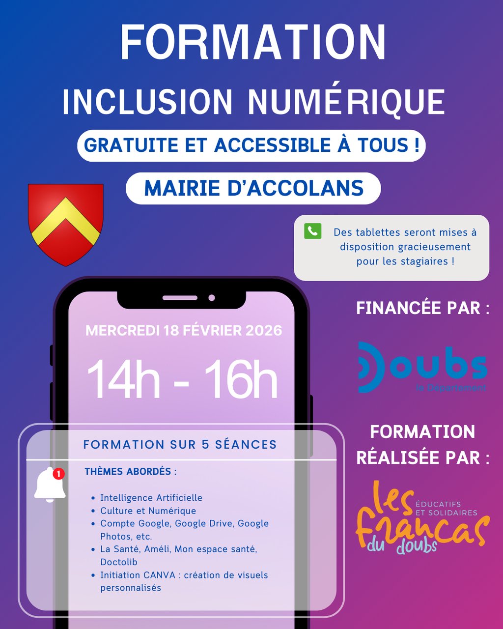 La mairie d’Accolans propose une formation inclusion numérique gratuite et ouverte à tous, à partir du mercredi 18 février de 14h à 16h.