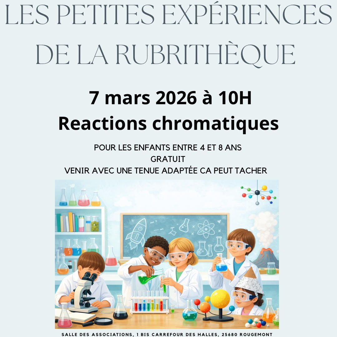 On se retrouve le 7 mars pour le prochain atelier du cycle des "Petits Scientifiques", nous explorons l'univers fascinant des Réactions Chromatiques.