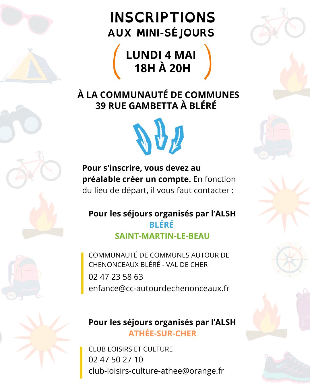- Pour les mini-séjours : Permanence le 4 mai de 18h à 20h à la Communauté de Communes, au 39 rue Gambetta à Bléré (Un seul mini-séjour par enfant, inscription réalisée par le représentant légal de l’enfant). Des inscriptions en ligne seront ensuite ouvertes jusqu’au 20 juin, dans la limite des places disponibles.