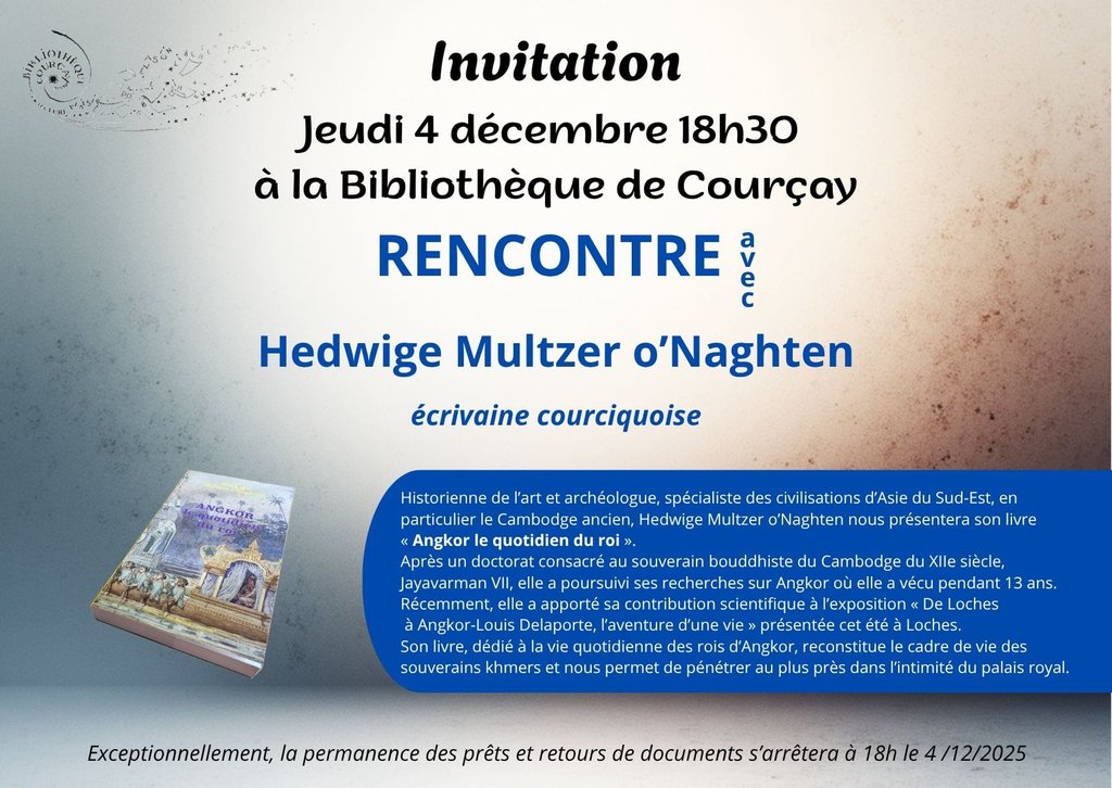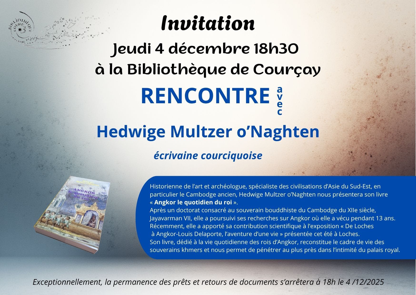 Invitation jeudi 4 décembre à 18h30 à la bibliothèque de Courçay pour une rencontre avec l'écrivaine courciquoise Hedwige Multzer o'Naghten.