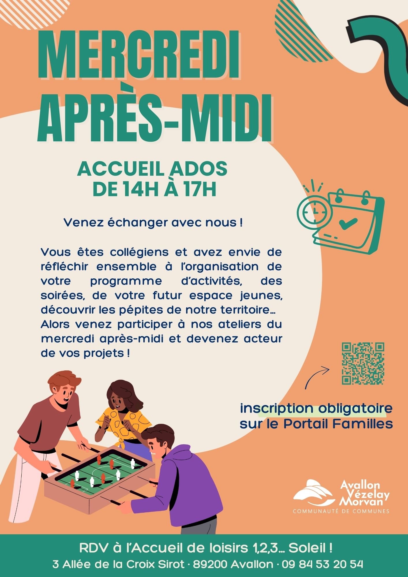 Vous êtes collégiens et avez envie de réfléchir ensemble à l’organisation de votre programme d’activités, des soirées, de votre futur espace jeunes... Alors venez participer à nos ateliers du mercredi après-midi et devenez acteur de vos projets !
