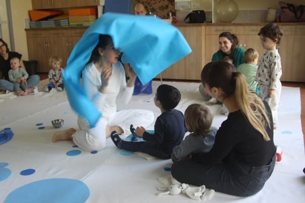 En amont des ateliers, un temps de rencontre et formation a permis aux professionnels des crèches et du service d’aide à domicile de la Communauté de Communes Bastides de Lomagne de rencontrer Elena Del Vento pour découvrir sa démarche artistique et mieux accompagner sa proposition.