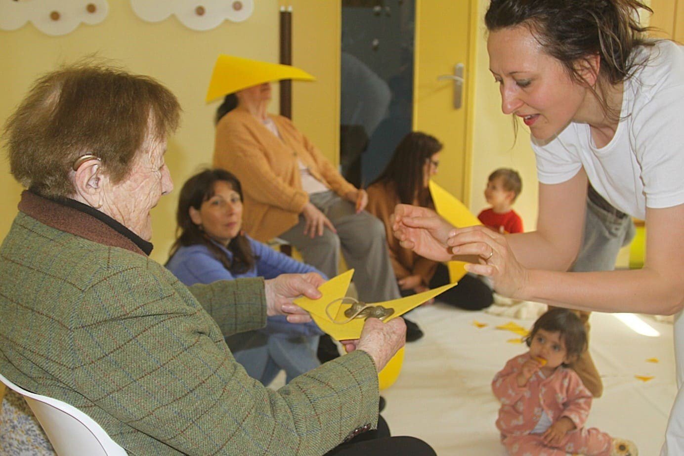 L’artiste a invité les enfants des crèches du territoire et les personnes bénéficiaires du service d’aide à domicile à se rencontrer autour de plusieurs temps d’atelier-performances. La manipulation de différentes formes géométriques colorées a conduit à des jeux sonores et des mouvements libres où chacun a pris le temps de découvrir l’autre. Peu de parole, mais beaucoup de regards complices et d’émotions spontanées entre les participants, petits et grands.