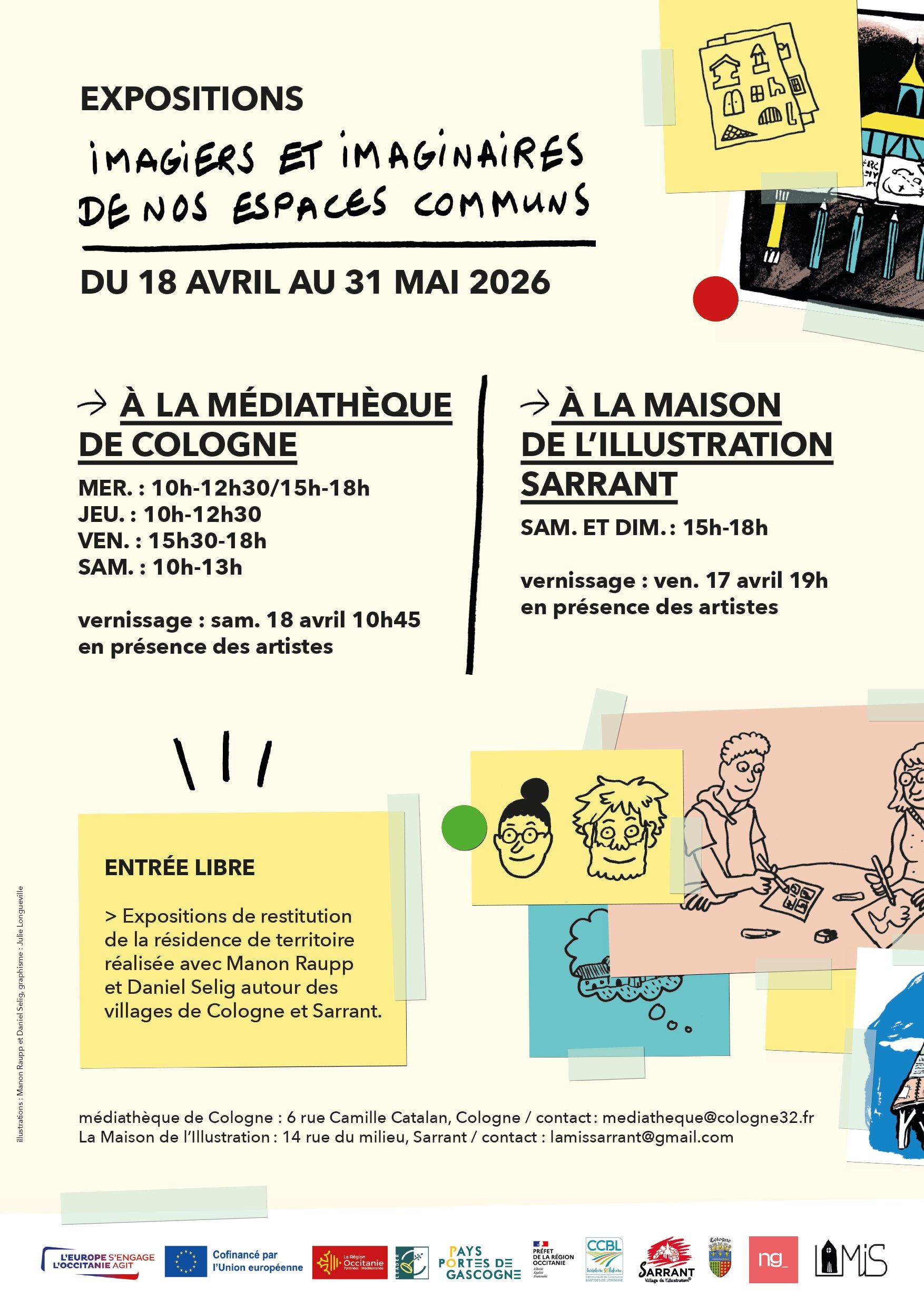 La Maison de l'Illustration de Sarrant, l'association Ligne de Mire à Cologne et la Communauté de Communes Bastides de Lomagne invitent de janvier à avril 2026 les artistes Manon Raupp et Daniel Selig à réfléchir autour de cette question. Ils proposent des temps de rencontre et de pratiques artistiques pour tous les âges afin de (re)penser ensemble nos espaces communes, d'hier, d'aujourd'hui et de demain.