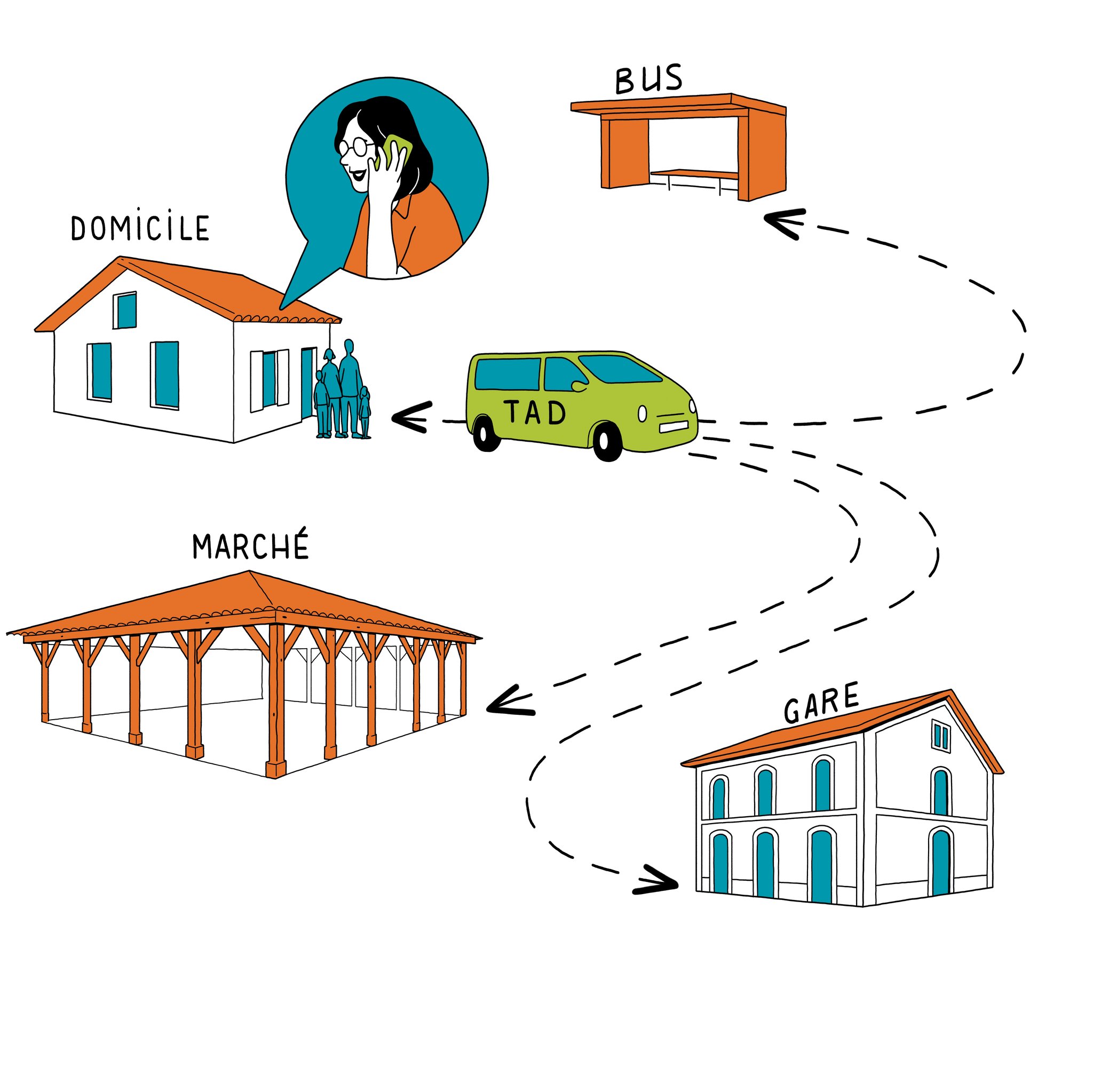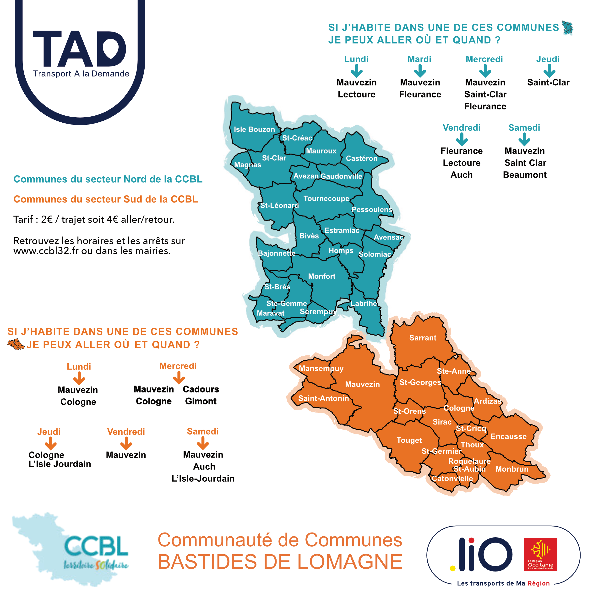 Le TAD est un service de transport qui vient chercher l’habitant à domicile, l’amène à une destination précise puis le ramène à domicile, dans des créneaux horaires prédéfinis et suivant le secteur Nord et Sud de la CCBL. Voir flyer