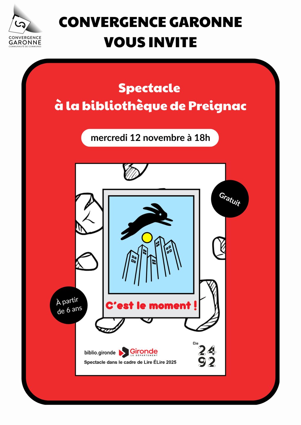 Dans le cadre du prix Lire Elire 2025, Convergence Garonne vous invite au spectacle « C’est le moment » à la bibliothèque intercommunale de Preignac !