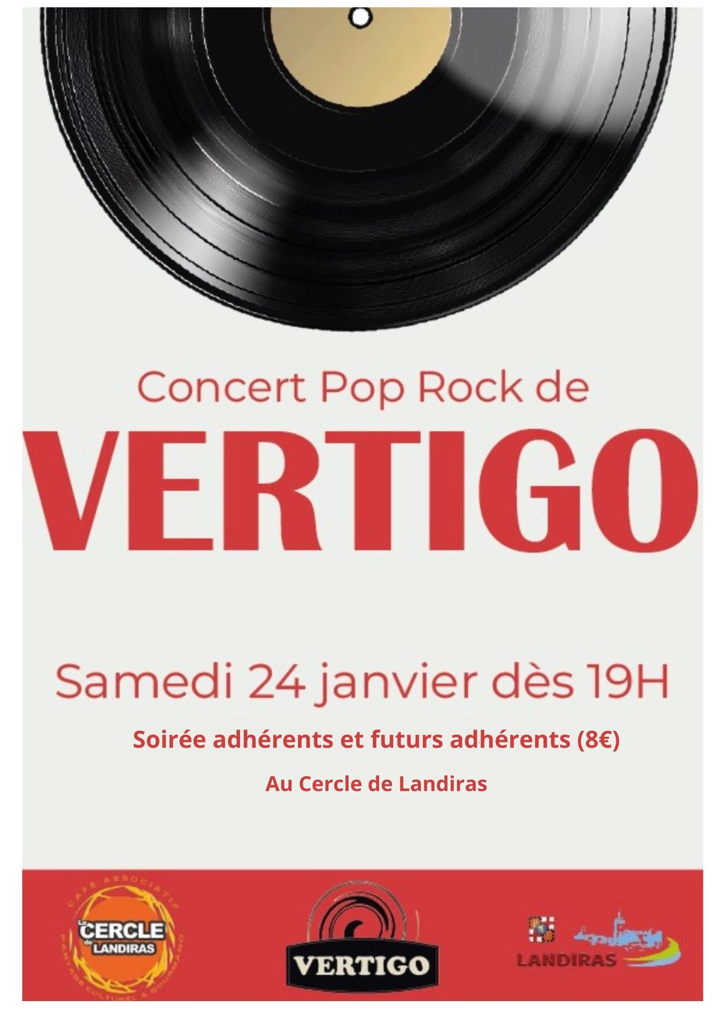L'association Le Cercle organise une soirée d'adhésion pour l'année 2026 qui est animée par le Groupe Vertigo. Le groupe Vertigo est un groupe de musique local de Landiras.